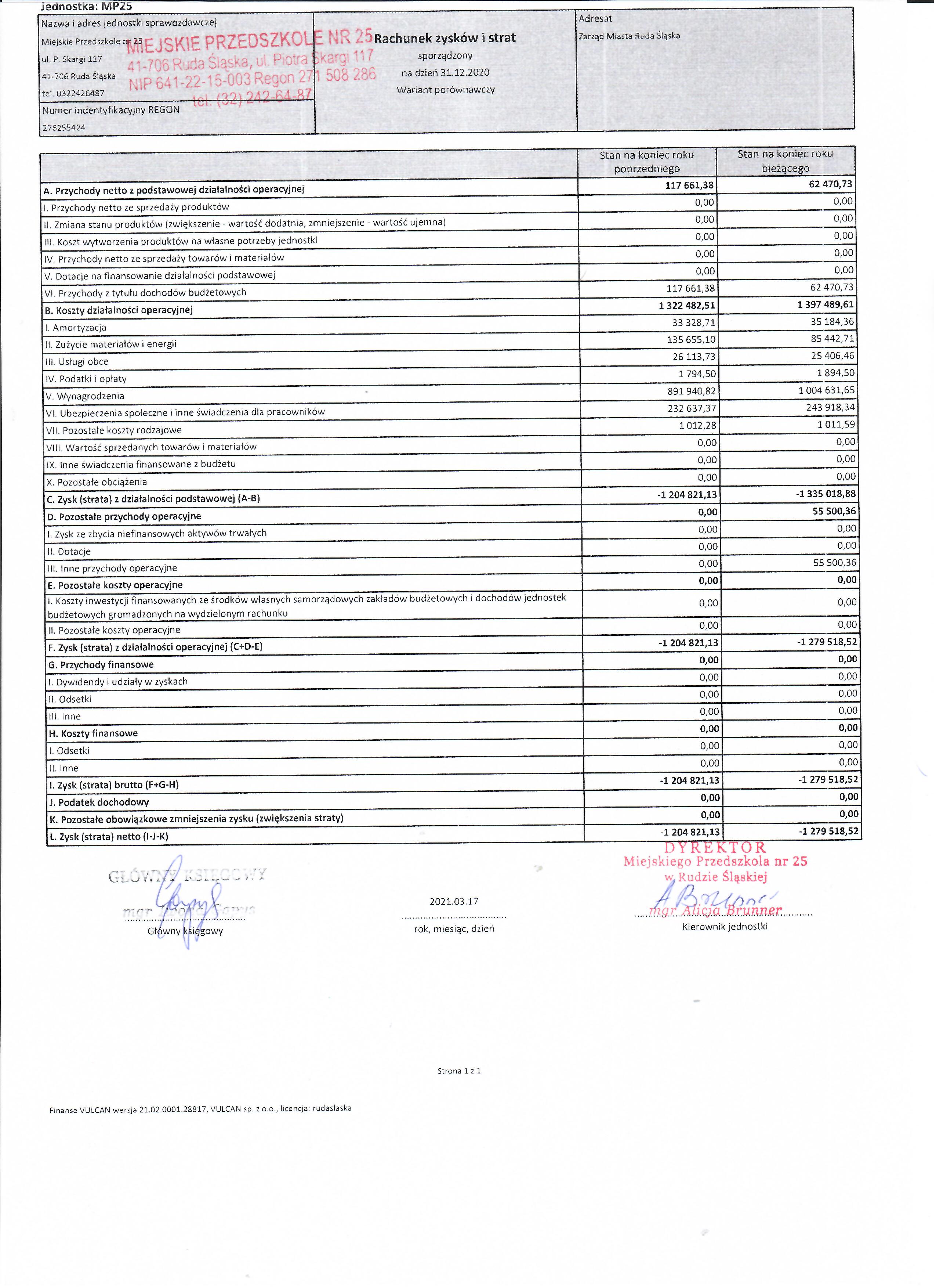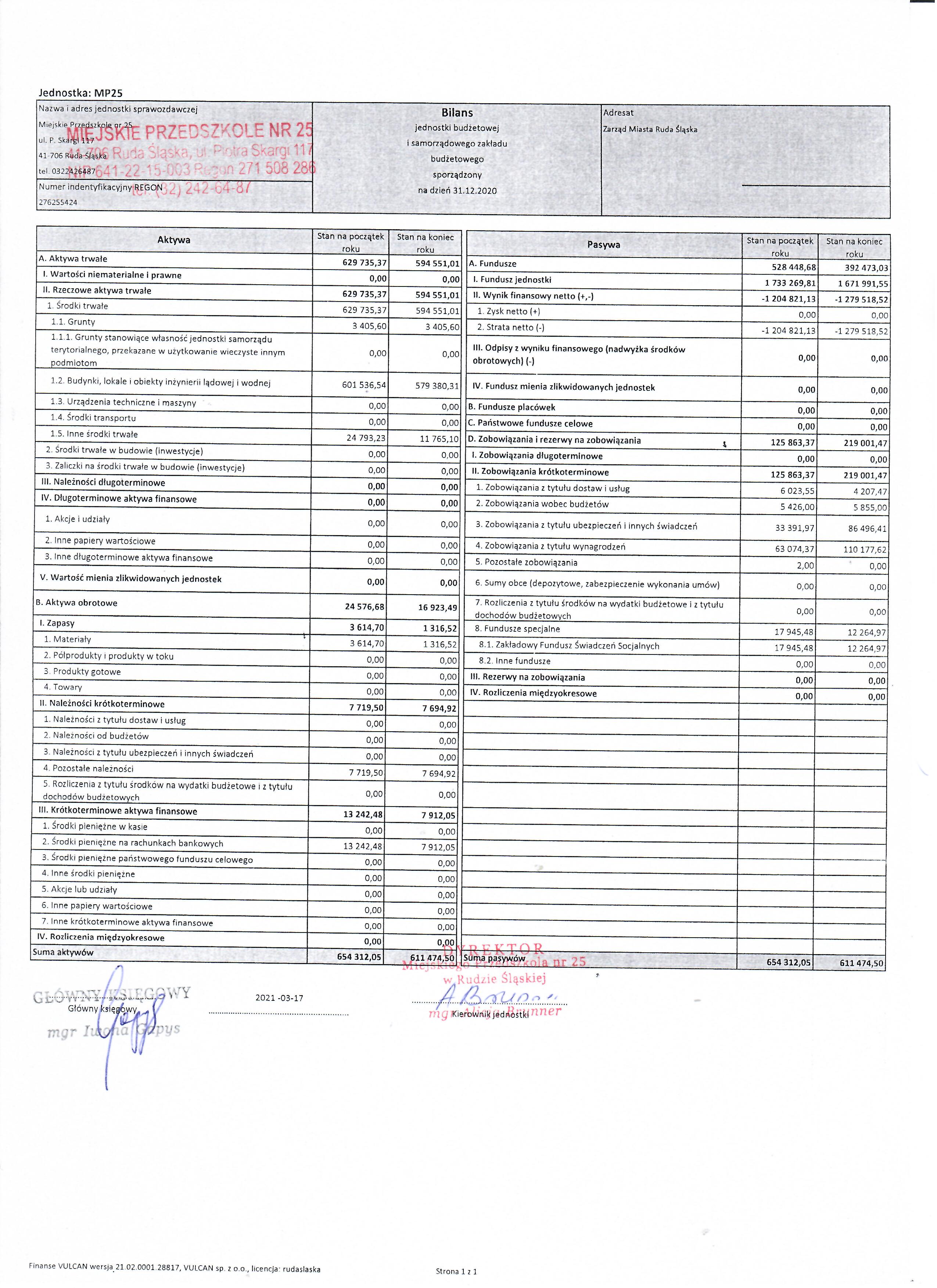 Sprawozdanie finansowe za 2024 rokUtworzono: 08 sierpień 2025 | Poprawiono: 08 sierpień 2025 | Opublikowano: 08 sierpień 2025 | Angelika Segiet | Drukuj | E-mail | Odsłony: 173 Sprawozdanie finansowe za 2024 rok (...) Załączniki: Bilans 2024 MP 25.pdf[ ]167 kB2025-08-08 21:11 Informacja_dodatkowa_za_rok_2024__Miejskie_Przedszkole_Nr_25.pdf[ ]265 kB2025-08-08 21:11 Rachunek zysków i strat 2024 MP 25.pdf[ ]143 kB2025-08-08 21:11 Zestawienie zmian w funduszu 2024 MP 25.pdf[ ]132 kB2025-08-08 21:11
